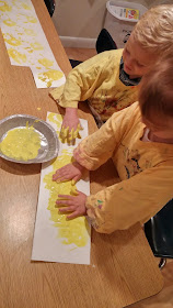 We decided to make some big sunflowers for our classroom. Last week we measured the height of our sunflowers using string. We also worked together to paint some large pieces of paper yellow so we could make the petals.